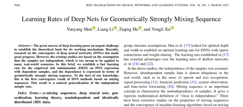 In the field of fundamental machine learning theory, the convergence analysis of Deep Neural Networks (DNNs) has always been a core research topic. Most existing studies are based on the assumption of sample independence; however, data in real-world scenarios often exhibits complex dependency structures, such as in speech recognition, financial prediction, and time series analysis. To address this challenge, a team led by Yueyang Men from Beijing University of Chemical Technology collaborated with a team led by Yongli Xu from Beijing University of Technology to propose, for the first time, a theoretical framework for fast learning rates of DNNs based on Geometrically Strongly Mixing Sequences. This work provides theoretical support for deep learning algorithms under non-independent smples. The findings have been published in IEEE Transactions on Neural Networks and Learning Systems, a top-tier journal in the field of artificial intelligence.